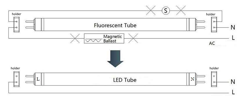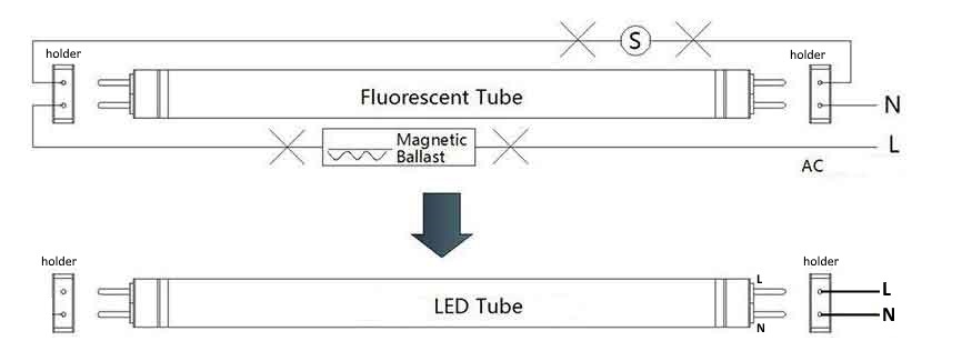 Namun, walaupun terdapat persamaan fizikal, tiub LED T8 mempunyai semua komponen yang diperlukan untuk beroperasi yang terbina di dalam tiub itu sendiri, ini bermaksud bahawa tiup LED tidak memerlukan choke ballast dan starter. Tiup LED boleh disambung dengan bekalan kuasa 230VAC secara terus atau direct pada terminalnya Live(L) dan Neutral(N). Perlu diketahui bahawa terdapat dua jenis model terminal tiup LED biasanya ditunjukkan dengan tanda "L" dan "N". Satu yang mana jenis model terminal L dan N pada satu hujung sahaja, terminal di hujung sebelah lagi tidak mempunyai fungsi elektrik dan hanya ada untuk membolehkan tiub masuk ke dalam pemegang lampu pendarfluor sahaja. Satu lagi jenis model tiup LED yang mana terminal L disatu hujung dan N dihujung yang lain. Seperti yang telah disebutkan sebelumnya, tiub LED sudah mempunyai pemacu LED yang terpasang di dalam tiub LED itu sendiri yang bermaksud bahawa untuk menghidupkan tiub LED hanya memerlukannya dibekalkan dengan Live dan Neutral (AC) secara langsung sahaja, menjadikan konfigurasi choke ballast dan starter tidak perlu. Choke ballast dan starter boleh dibuang dari housing atau diubah-suai wiringnya sahaja.