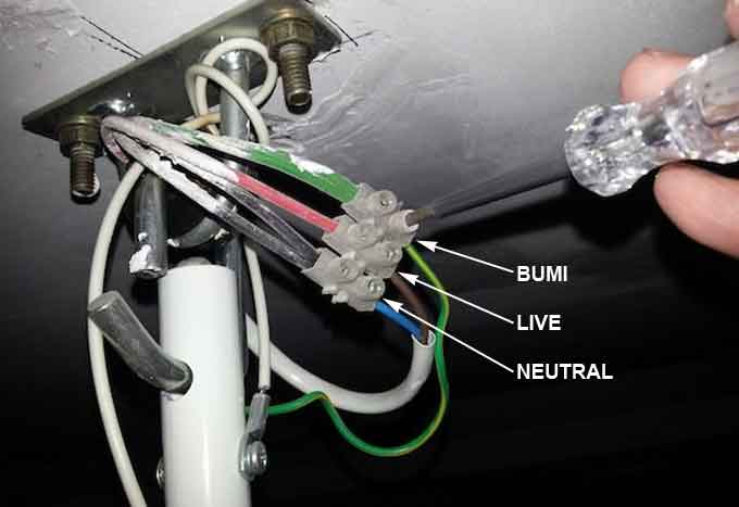 Pendawaian Kipas Siling dengan Suis sehala & Suis Pengatur Kelajuan. Suis sehala untuk on kipas dan seterusnya pengatur kelajuan mengawal kelajuan kipas. Kabel bumi: Sambungkan wayar Hijau / Hijau+Kuning dari wayer kipas ke wayer bumi bekalan kuasa. Kabel Neutral: Sambungkan wayar hitam dari mata kipas bekalan kuasa ke wayar neutral kipas siling. Kabel fasa hidup: Sambungkan wayar fasa merah yang masuk dari db ke suis 1 way dan seterusnya ke suis pengatur kelajuan kipas iaitu suis sehala dan ke pengawal kelajuan kipas secara siri (serial), sambungkan wayar merah live yang datang dari pengatur kelajuan ke wayer live kipas siling. Dengan cara ini, suis sehala, suis pengatur kelajuan dan kipas dihubungkan secara bersiri melalui wayar live. Warna kabel neutral dan pada kipas boleh dirujuk pada kertas manual model kipas itu, jika dipasang terbalik, ianya tidak merosakkan kipas tetapi kipas akan berputar terbalik. Kipas telah bersambung dengan bekalan kuasa 230VAC. Gunakan penutup wayar bentuk kon pada kipas siling untuk menutup sambungan. Kini boleh menghidupkan suis pemutus litar utama db dan suis kipas untuk menguji kipas siling dengan kelajuan yang berbeza dengan memutar suis pengawal kelajuan (speed regulator).