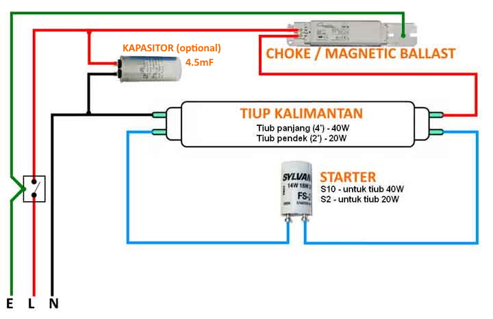 Untuk wiring lampu gunakan kabel 1.5mm persegi. Lampu Kalimantang panjang 4 Kaki 36Watt menggunakan Ballast Magnetik 40Watt, starter S10 dan 'optional' kapasitor 4.5mikroFarad. Bekalan kuasa diambil dari sumber db fius 5A atau mcb 6A. Pastikan bekalan kuasa dimatikan sebelum kerja pendawaian dilakukan. Sambungkan wayer neutral pada bar neutral dan terus ke point lampu dan sambungkan wayar bumi pada bar bumi ke kotak suis dan ke point lampu, manakala sambungkan wayar Fasa hidup[L] ke sisi keluar dari MCB 6A atau 10A[Maksimum] dari Papan Pengedaran[DB] ke suis 1 way. Sambungkan wayar Fasa dari suis ke point lampu kalimantang (Fluorescent Light) dan sambungkan live ke satu point terminal Magnetic Ballast atau choke. Sambungkan satu wayar lain ke terminal output choke ballast dan sambungkan ke salah satu terminal pemegang tiup lampu pendarfluor. Sambungkan wayar dari terminal pemegang tiup Lampu sebelah lagi ke terminal tapak Starter. Sambungkan wayar dari terminal kedua tapak Starter ke pemegang kedua tiup Lampu kalimantan. Sambungkan wayar Neutral[N] ke terminal pemegang mentol(lamp holder) yang tidak bersambung pada pemegang kedua Lampu Fluorescent seperti yang ditunjukkan dalam rajah. Sambungkan wayar Bumi[E] ke body housing lampu, pastikan lapisan cat housing lampu dikikis sedikit untuk lekatan bumi yang berkesan.