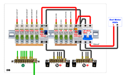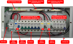 PAPAN AGIHAN (DB) - Berfungsi sebagai pengagihan litar akhir dan perlindungan arus lebihan . Berfungsi sebagai pengagihan litar-litar akhir kecil serta pelindungan lebihan arus dan perlindungan litar bocor ke bumi. Alat yang terdiri dalamnya seperti busbar, DIN Rail mounting, terminal Neutral dan Bumi, sambungan mula ke litar akhir kecil. Bilangan hala (ways) adalah diantara 4 hala hingga 18 hala (satu atau tiga fasa). Hala simpanan (20%) hendaklah disediakan untuk litar lampu dan litar soket. Kalau DB lebih dari satu, numbering hendaklah dibuat berdasarkan tingkat, kawasan atau bangunan, DB lampu atau DB soket. Pengenalan ini penting untuk kerja pemasangan dan senggaraan. Susunan litar dan jenis serta bilangan beban hendaklah dicatitkan dilabel khas yang ditampal dibahagian penutup DB.